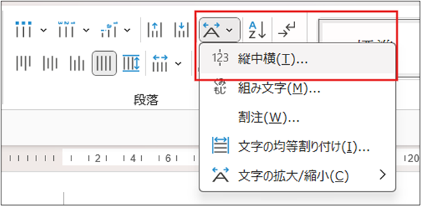 ・該当部分を範囲選択→「ホーム」タブ→「段落」グループ→「拡張書式」のアイコンから、プルダウンで「縦中横」を選択。