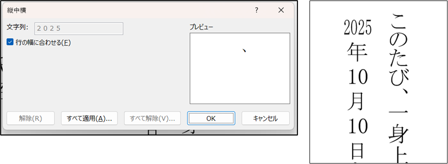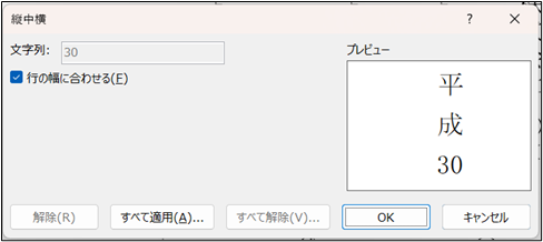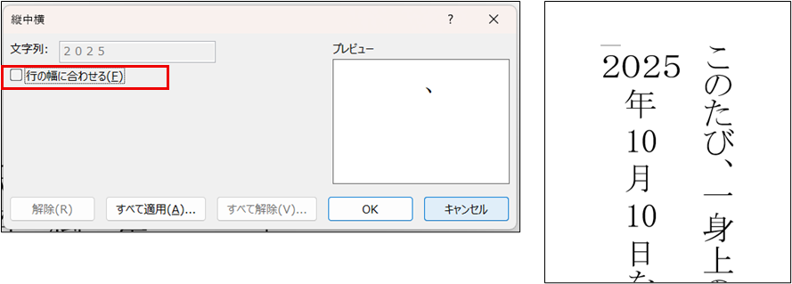 設定は先ほど同様に、「縦中横」から行いますが、「行の幅に合わせる」にチェックを入れた場合・入れない場合の違いを確認していきます。