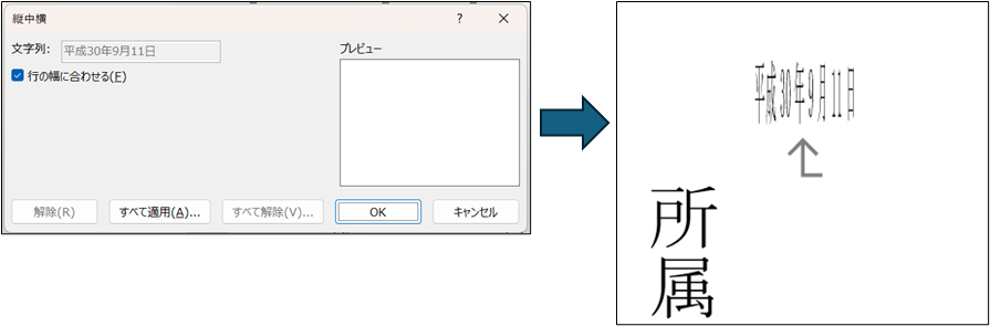 例として、「平成30年9月11日」を全て範囲選択して、縦中横の設定をしてみます。